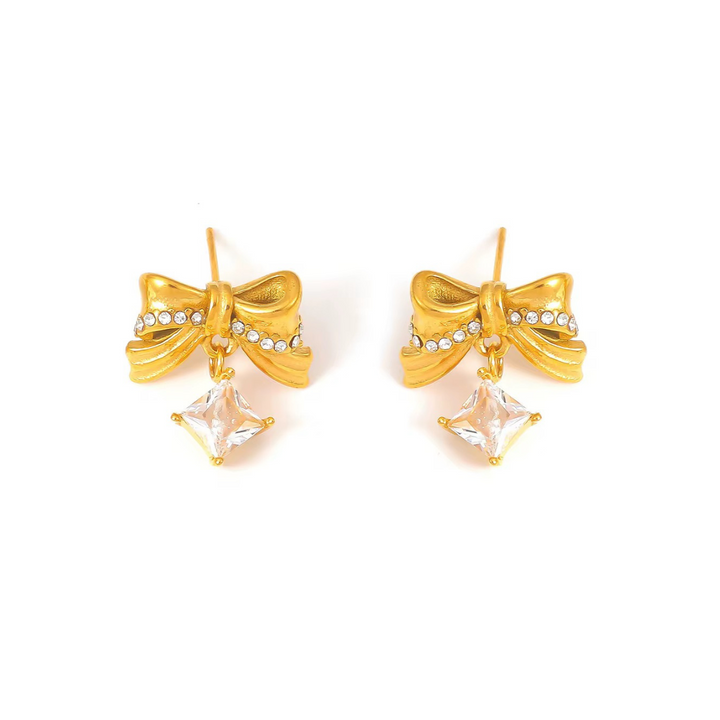 18KT Gold Plated Statement Bowtie and rhinestone Stainless Steel Waterproof Earrings, Matilda